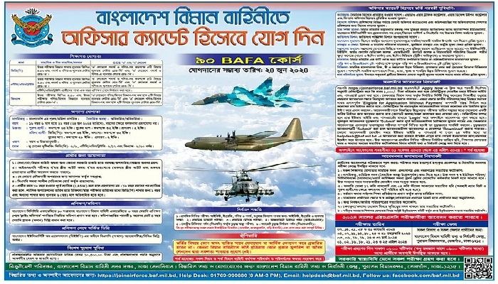 বাংলাদেশ বিমানবাহিনী ৯০তম বিএএফএ কোর্সে অফিসার ক্যাডেট হিসেবে সারা দেশ থেকে লোক নেবে। বিমানবাহিনীর ওয়েবসাইট ও পত্রিকায় এ-সংক্রান্ত নিয়োগ বিজ্ঞপ্তি প্রকাশ করা হয়েছে। নারী-পুরুষ উভয়েই আবেদনের সুযোগ পাবেন। বিমানবাহিনীতে পেশা গড়ার স্বপ্ন যাদের, তারা আবেদন করতে পারেন। ২০২৪ সালের এইচএসসি পরীক্ষার্থীরাও আবেদন করতে পারবেন।