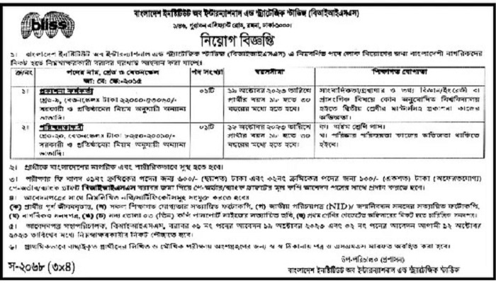 বাংলাদেশ ইনস্টিটিউট অব ইন্টারন্যাশনাল অ্যান্ড স্ট্র্যাটেজিক স্টাডিজ (বিআইআইএসএস) জনবল নিয়োগে বিজ্ঞপ্তি প্রকাশ করেছে। এ প্রতিষ্ঠানে দুই ক্যাটাগরির পদে ৯ম ও ২০তম গ্রেডে দুজনকে নিয়োগ দেওয়া হবে। আগ্রহী প্রার্থীদের সরাসরি বা ডাকযোগে আবেদনপত্র পাঠাতে হবে।